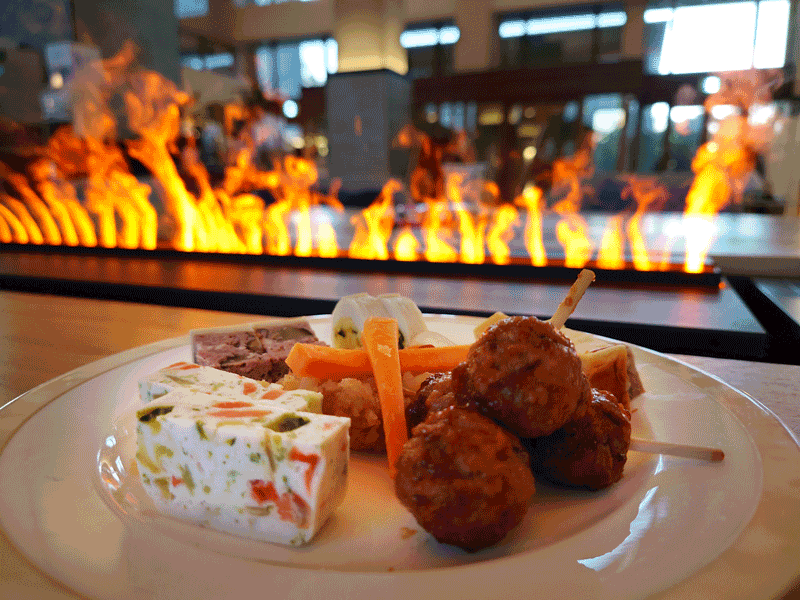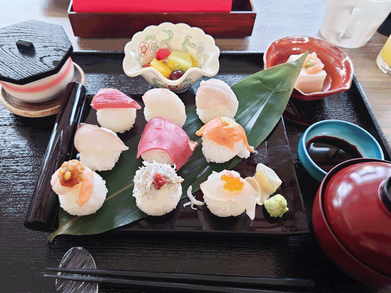 昼はラウンジで、手毬寿司と熊野牛のポロネーゼ。